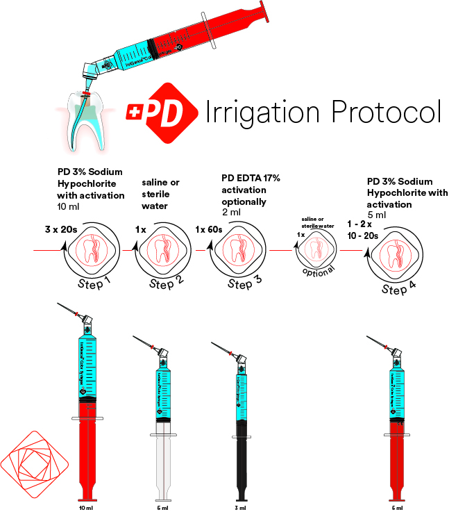 Le PD EDTA 17 % facilite l’instrumentation et l’élimination de la couche de boue dentinaire lors de la préparation chimico-mécanique du canal radiculaire. Il est utilisé pour l’irrigation du canal radiculaire, l’élimination des débris et le rinçage.